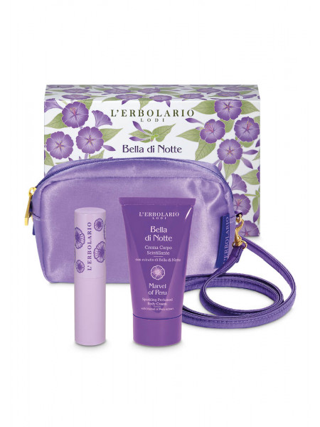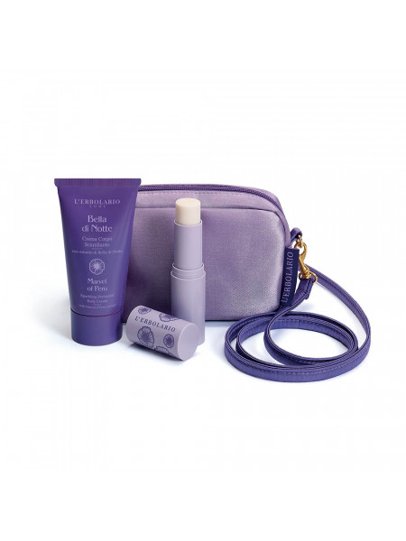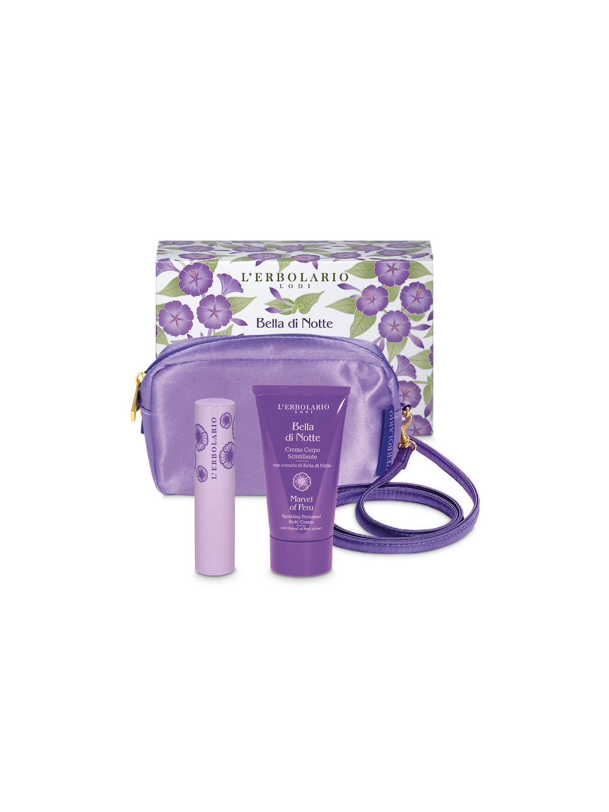 Un imperdibile kit donna con due cosmetici della linea Bella di Notte ideali per una serata speciale: il Profumo Solido dalle note fiorite e vanigliate e la Crema Corpo Scintillante, che idrata la pelle lasciandola ricoperta di finissimi glitter con un effetto illuminante. La pochette in tessuto viola impreziosisce il kit, rendendolo perfetto come idea regalo per lei. La Mini Beauty Bag Serata Scintillante contiene: