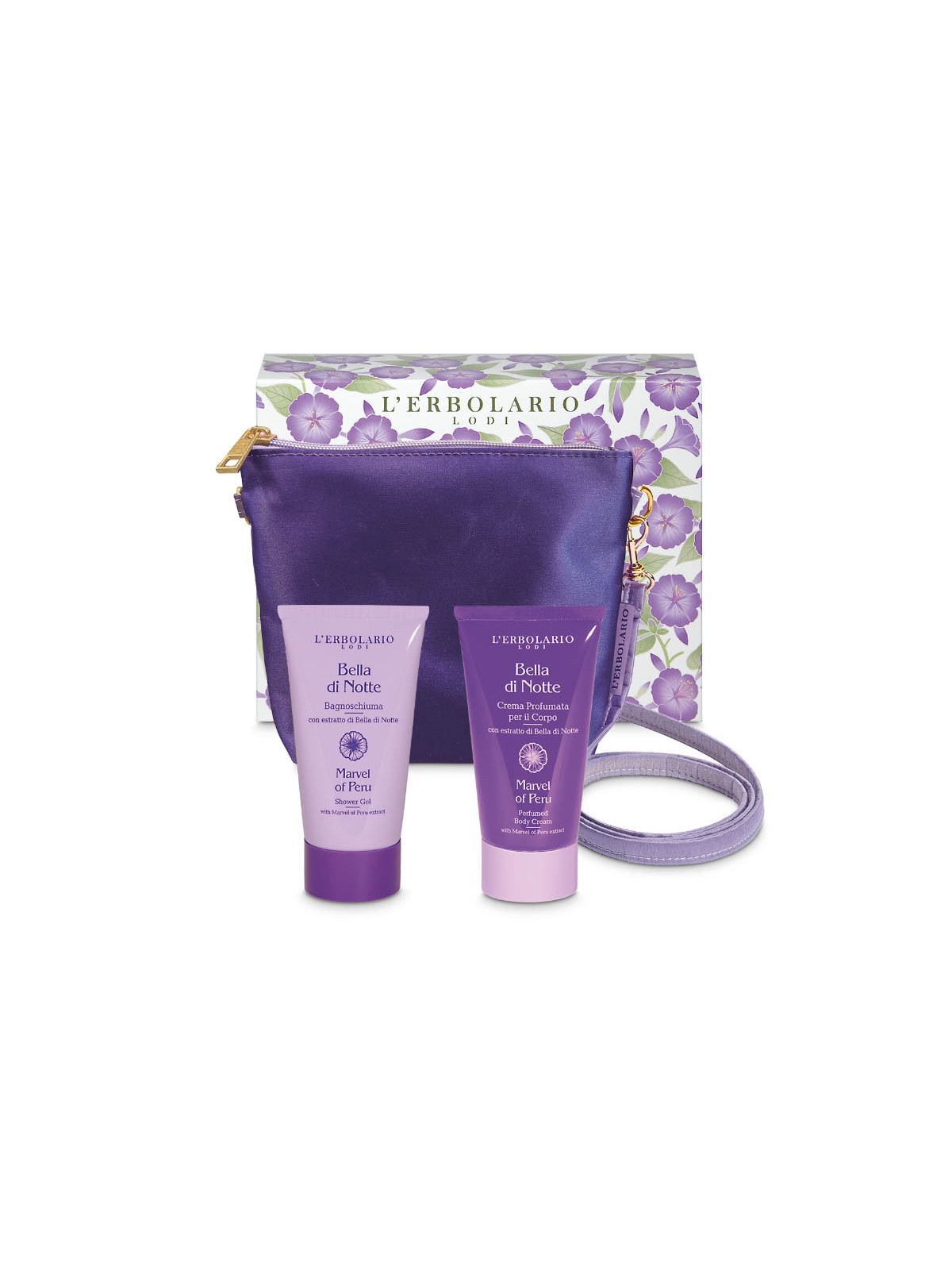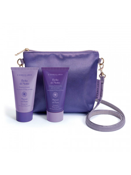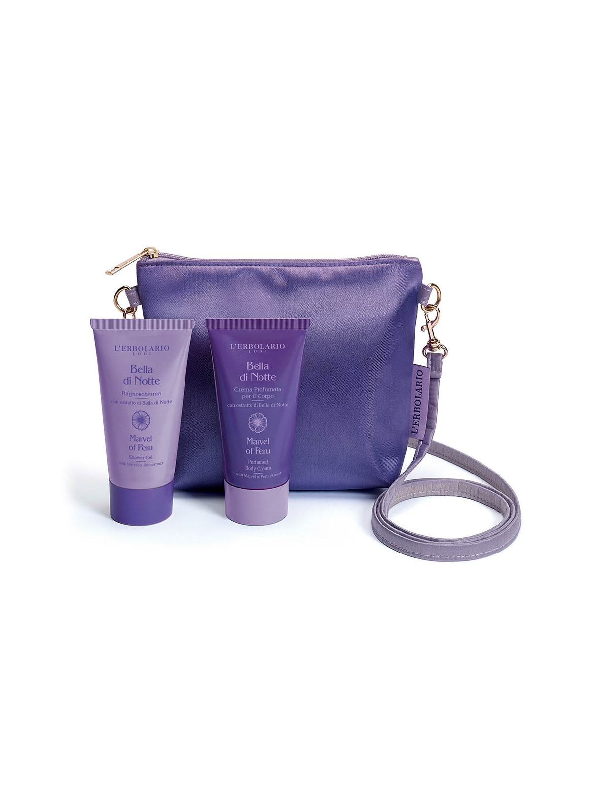 La deliziosa pochette in tessuto viola, dotata di comoda tracolla, contiene il Bagnoschiuma e la Crema Profumata per il Corpo della linea Bella di Notte, in pratici formati da viaggio. Una soluzione ideale per portare questi cosmetici sempre con sé, ma anche una bellissima idea regalo per lei, adatta a ogni occasione.