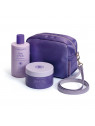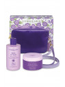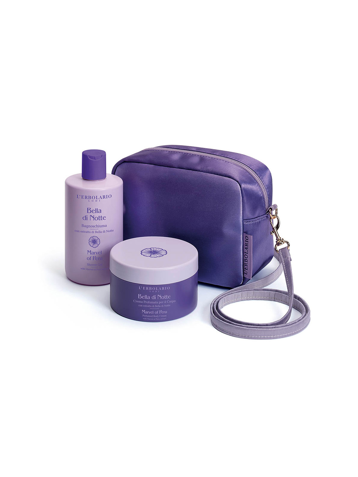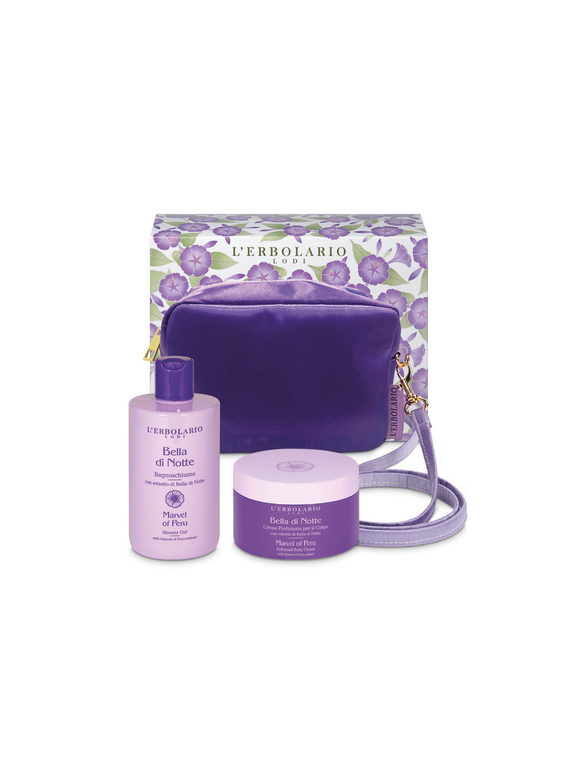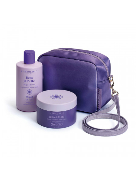 In questa raffinata pochette viola sono custoditi due cosmetici della linea Bella di Notte essenziali per la cura del corpo: il Bagnoschiuma e la Crema idratante profumata dalle note fiorite e vanigliate.
