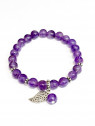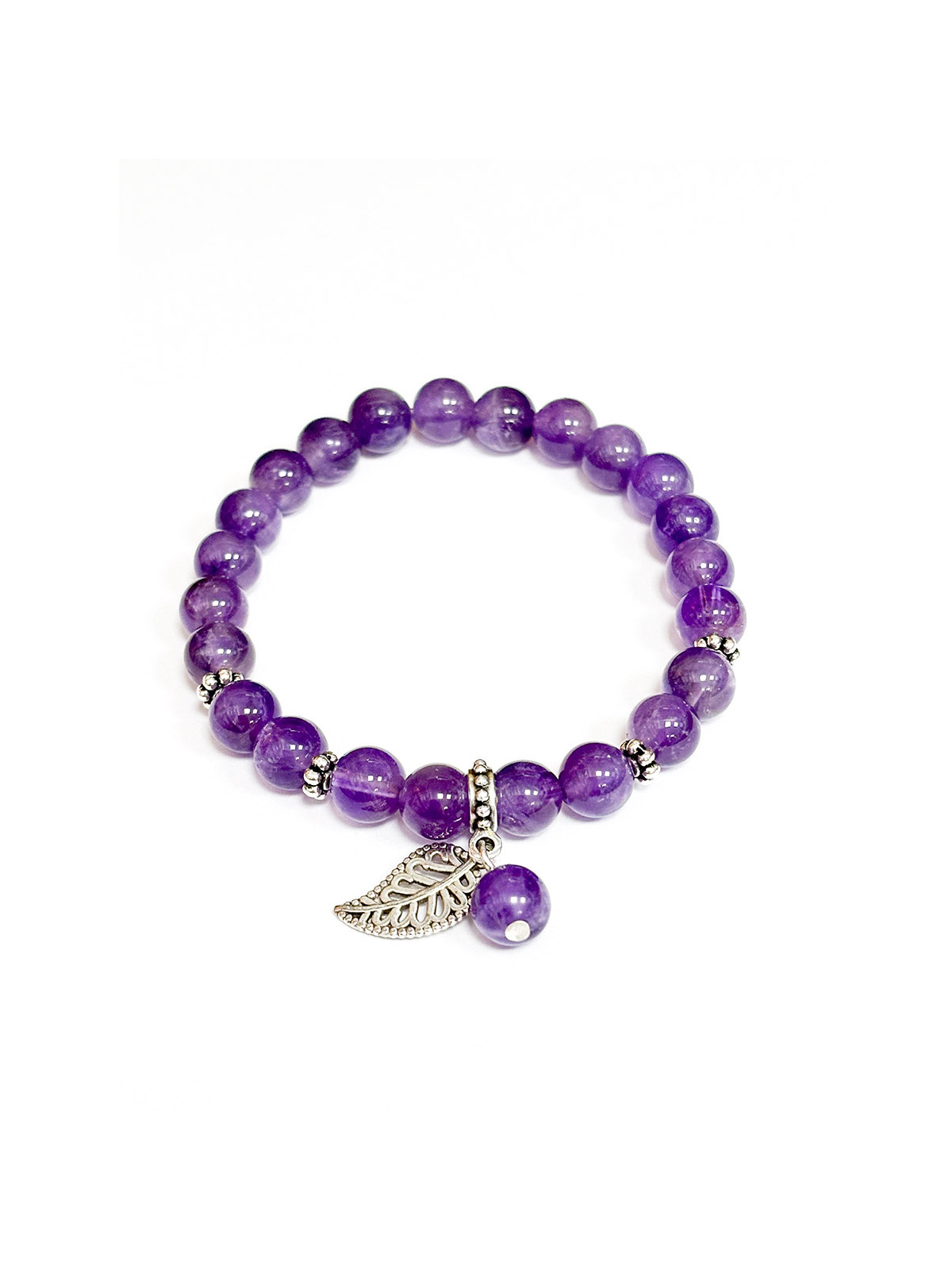 Bracciale elastico in pietre di ametista chiara, diametro grani circa 8 mm. Inserti in metallo nichel-free. Charm: foglia
