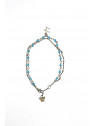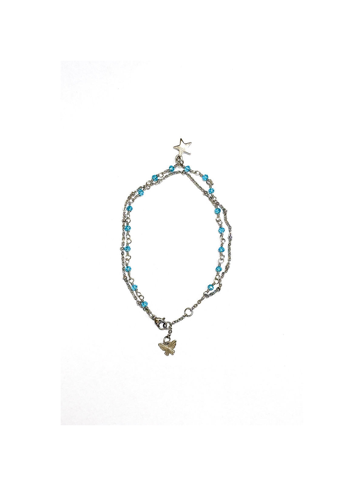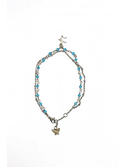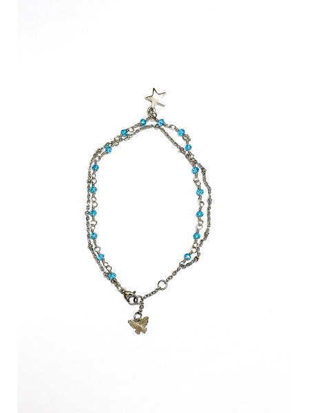 Cavigliera in acciaio. Chiusura regolabile. Doppio filo, pendente butterfly e charm stella. Pietre celesti
