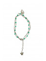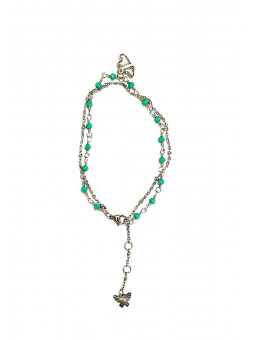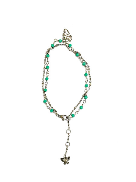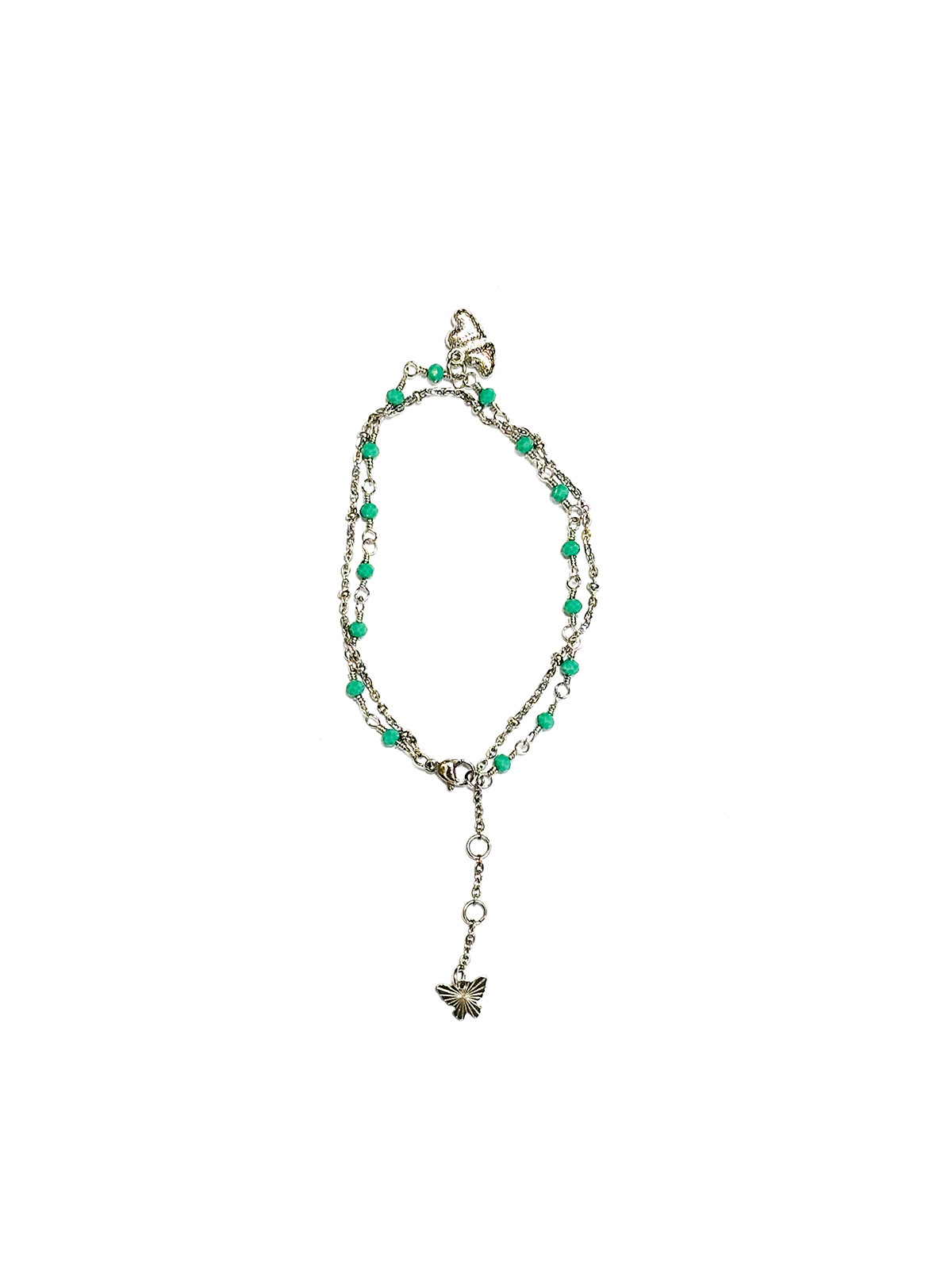 Cavigliera in acciaio. Chiusura regolabile. Doppio filo, pendente butterfly e charm cuoricini. Pietre verdi