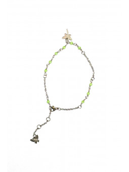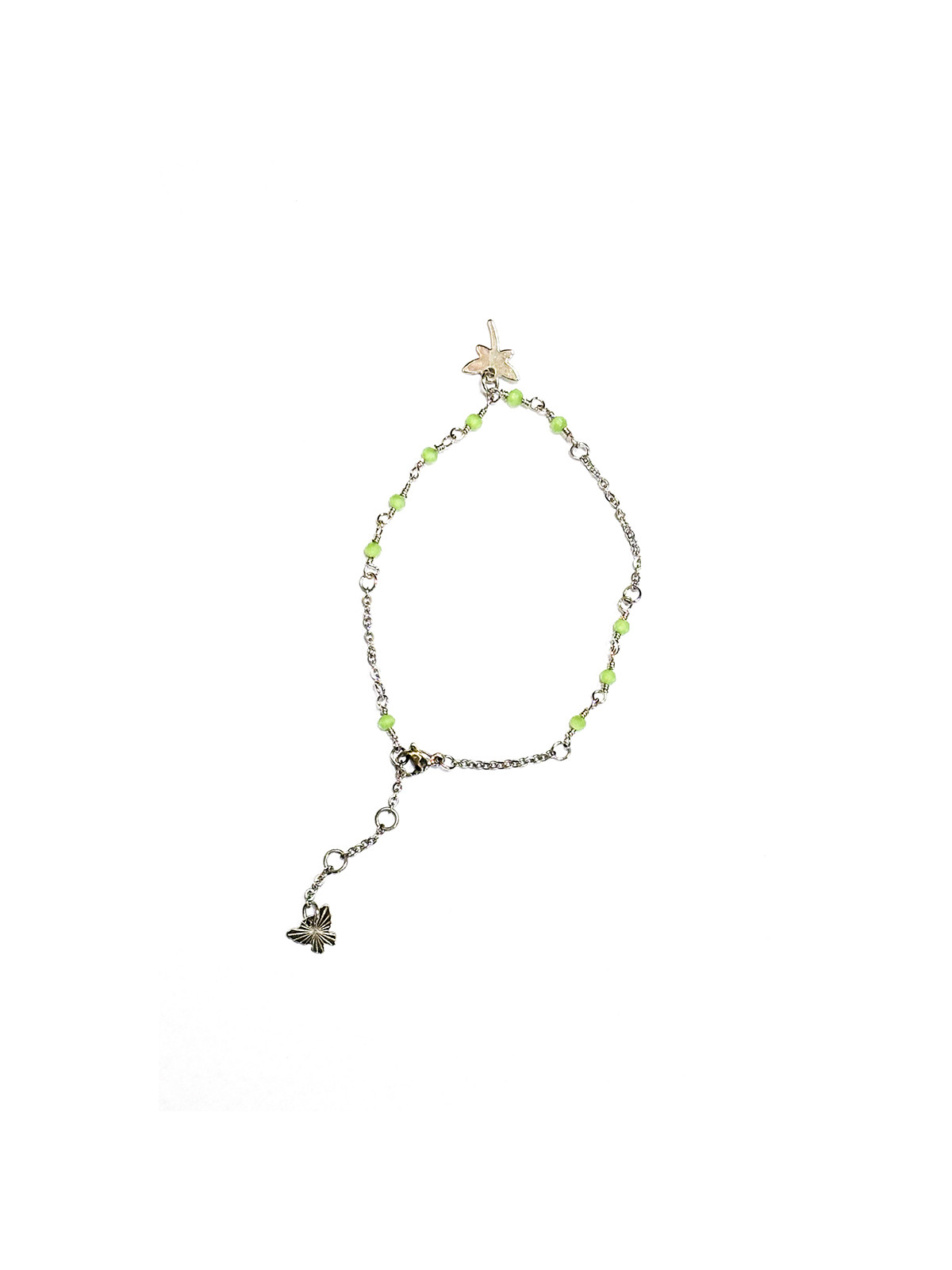 Cavigliera in acciaio. Chiusura regolabile. Filo singolo, pendente butterfly e charm libellula. Pietre verdi