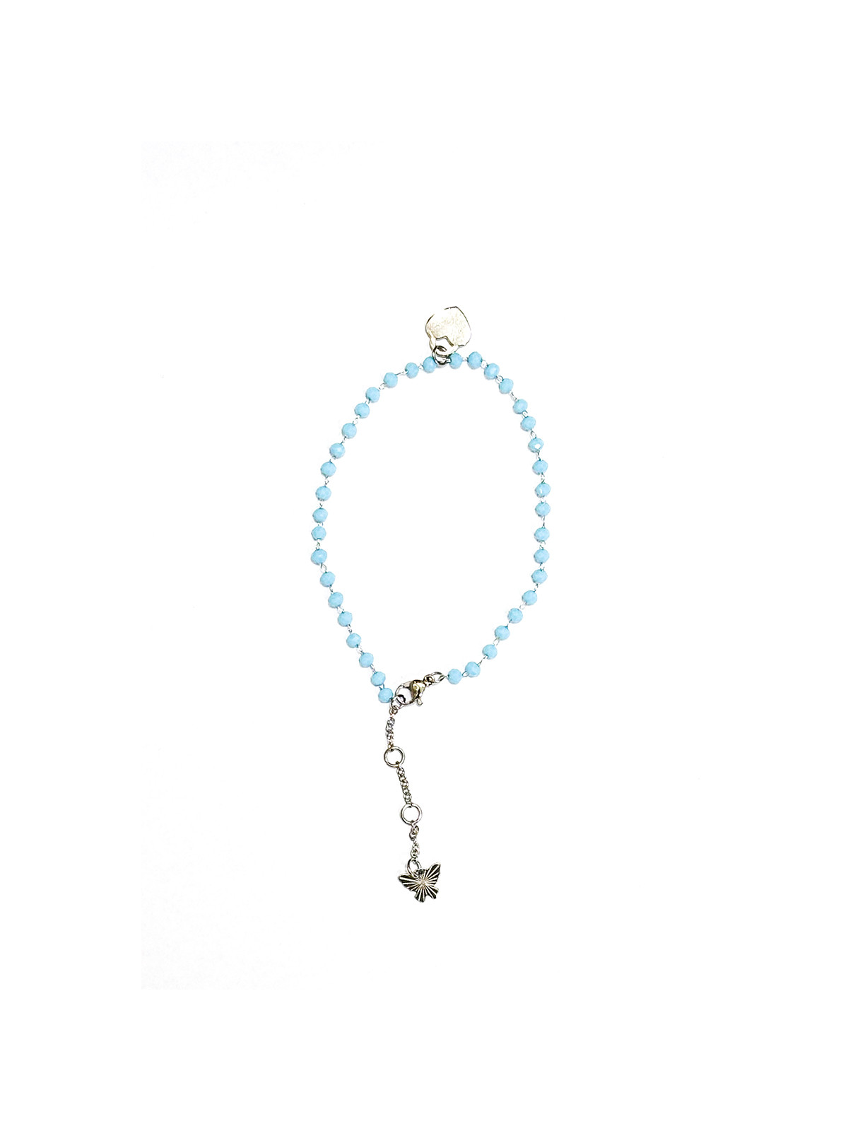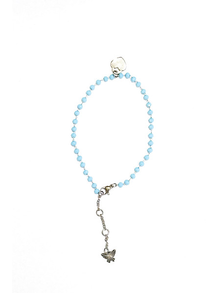 Cavigliera in acciaio. Chiusura regolabile. Filo singolo, pendente butterfly e charm cuore. Pietre celesti