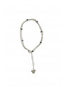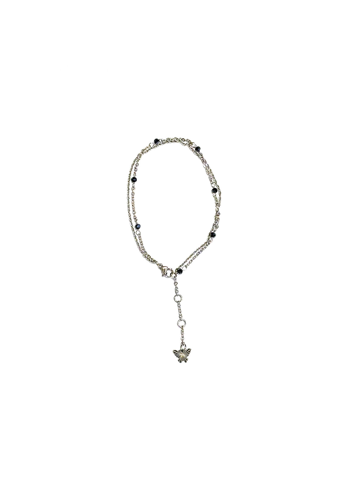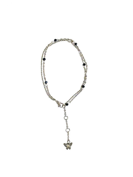 Cavigliera in acciaio. Chiusura regolabile. Doppio filo, pendente butterfly. Pietre nere