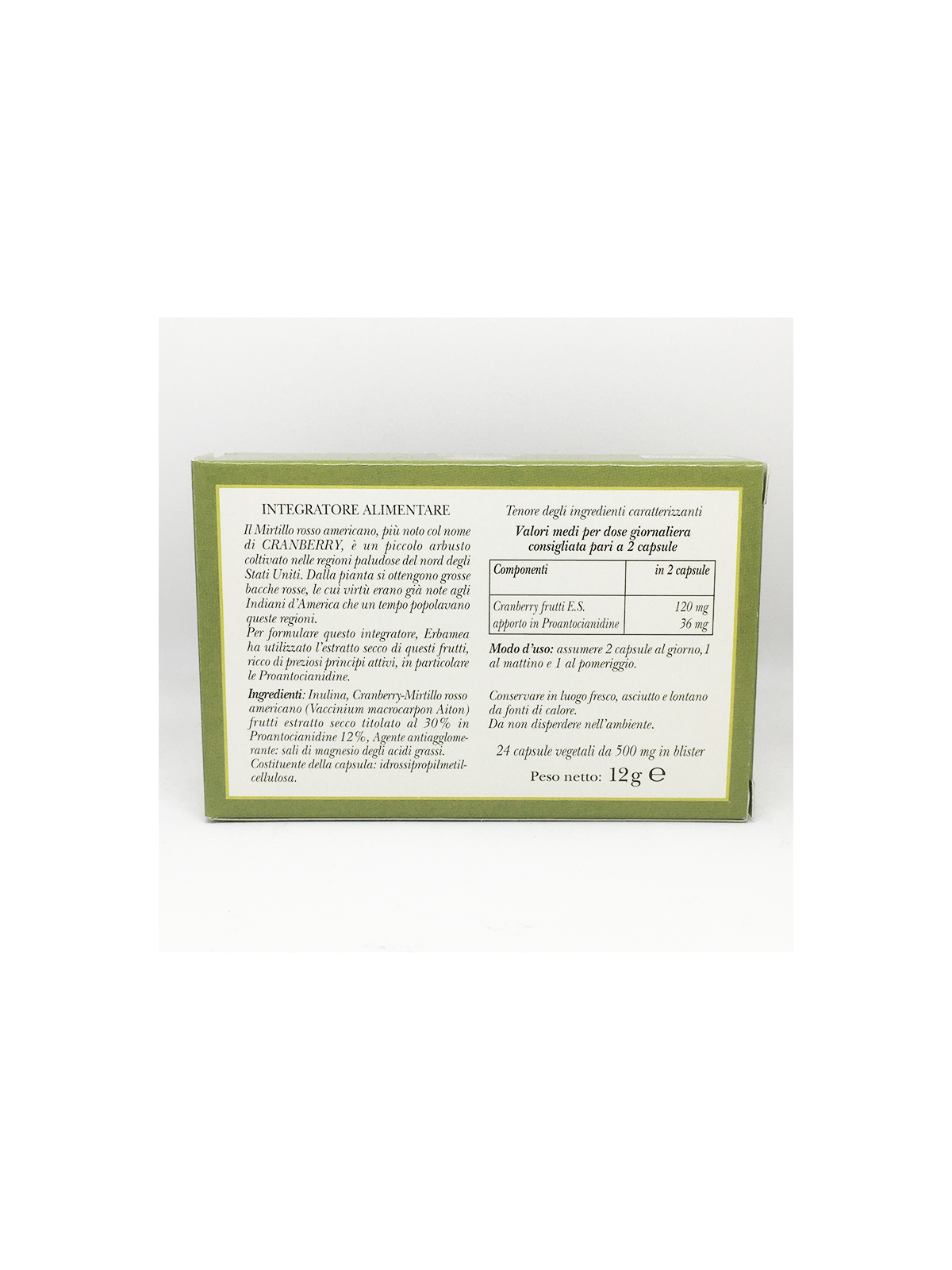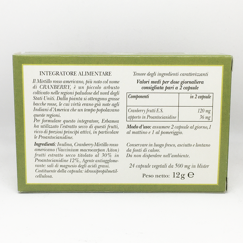 Il Mirtillo rosso americano (Vaccinium macrocarpon), più noto con il nome di Cranberry, è il frutto di un piccolo arbusto spontaneo, oggi coltivato nelle zone paludose del nord degli Stati Uniti. Le salutari proprietà di queste bacche erano già note agli Indiani d’America nativi di queste zone, che le consideravano un importante ingrediente della loro alimentazione e medicina tradizionale. Virtù riconosciute oggi, alla luce delle moderne conoscenze scientifiche, che hanno indicato le Proantocianidine contenute in questi piccoli frutti come principi attivi utili per favorire il benessere. Il Cranberry è l’ingrediente attivo scelto anche da Erbamea per formulare un integratore alimentare naturalmente efficace e specifico. La ricetta punta sull’estratto secco standardizzato di questi frutti, che contiene significative quantità di Proantocianidine: ben 36 mg nella dose giornaliera consigliata, corrispondente a 2 capsule.