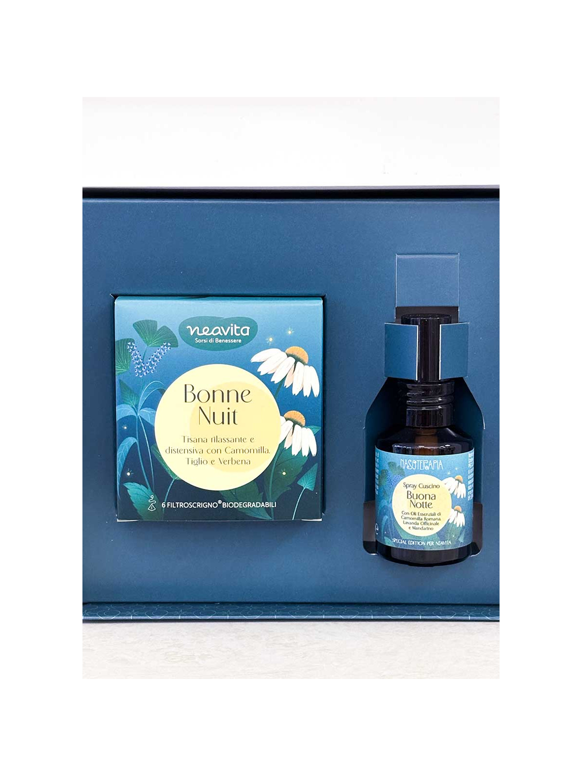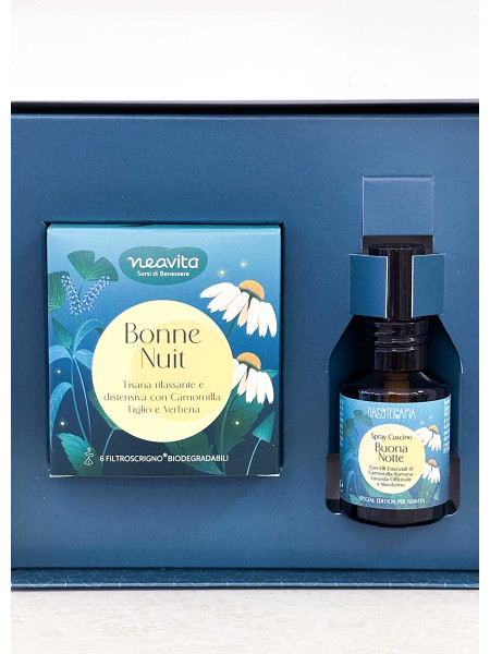 La bellezza dei colori e i dolci sapori di frutta e fiori, insieme alle proprietà di camomilla, verbena e tiglio, portano nella mente l'armonia di una musica silenziosa, che come un abbraccio calma i pensieri, mitiga la coscienza e accompagna piano nella quiete della notte. Formato: cofanetto con 6 filtroscrigno. + spray cuscino 30 ml.