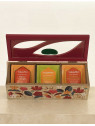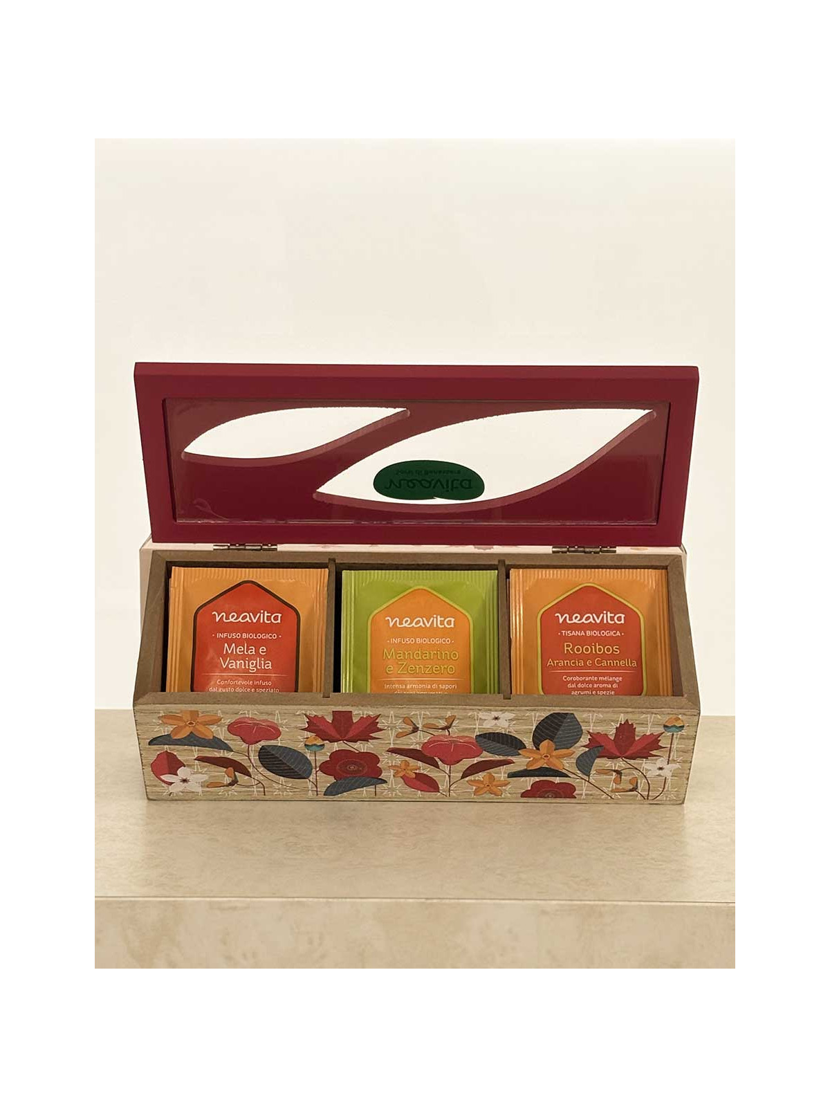 5 bustine per ogni tipo di infuso: Mela e vaniglia, Mandarino e Zenzero, Rooibos Arancia e cannella.