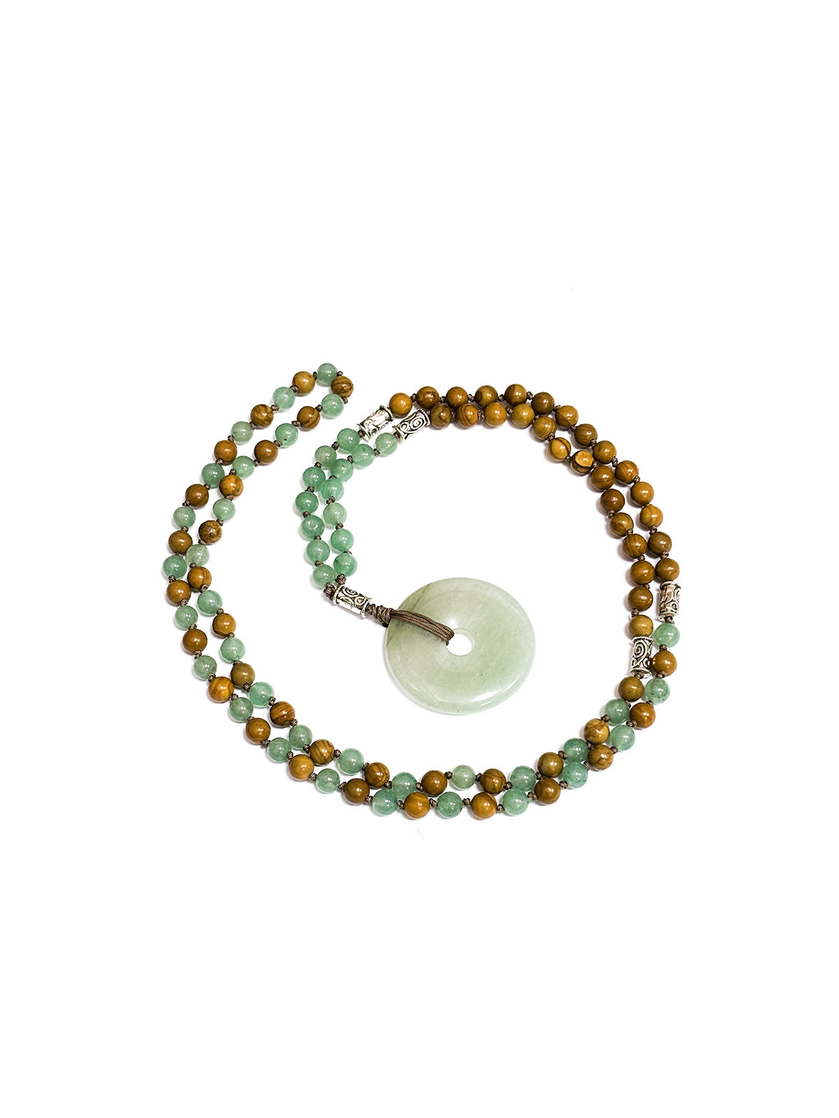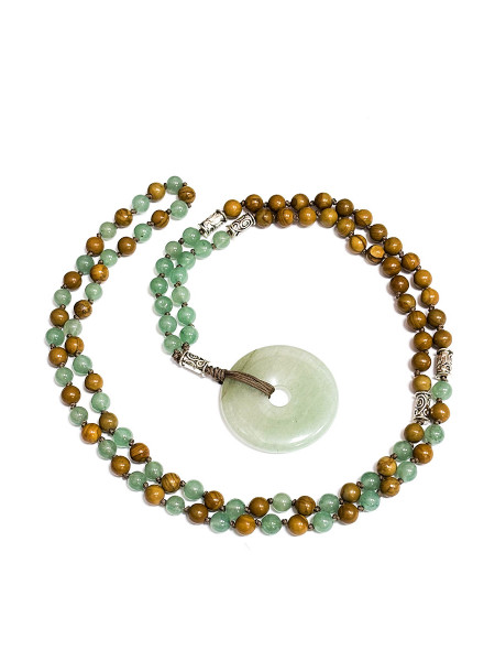 Mala stile tibetano 108 pietre fatto a mano con pietre di avventurina verde e perline di legno. Dimensione grani circa 6 mm.