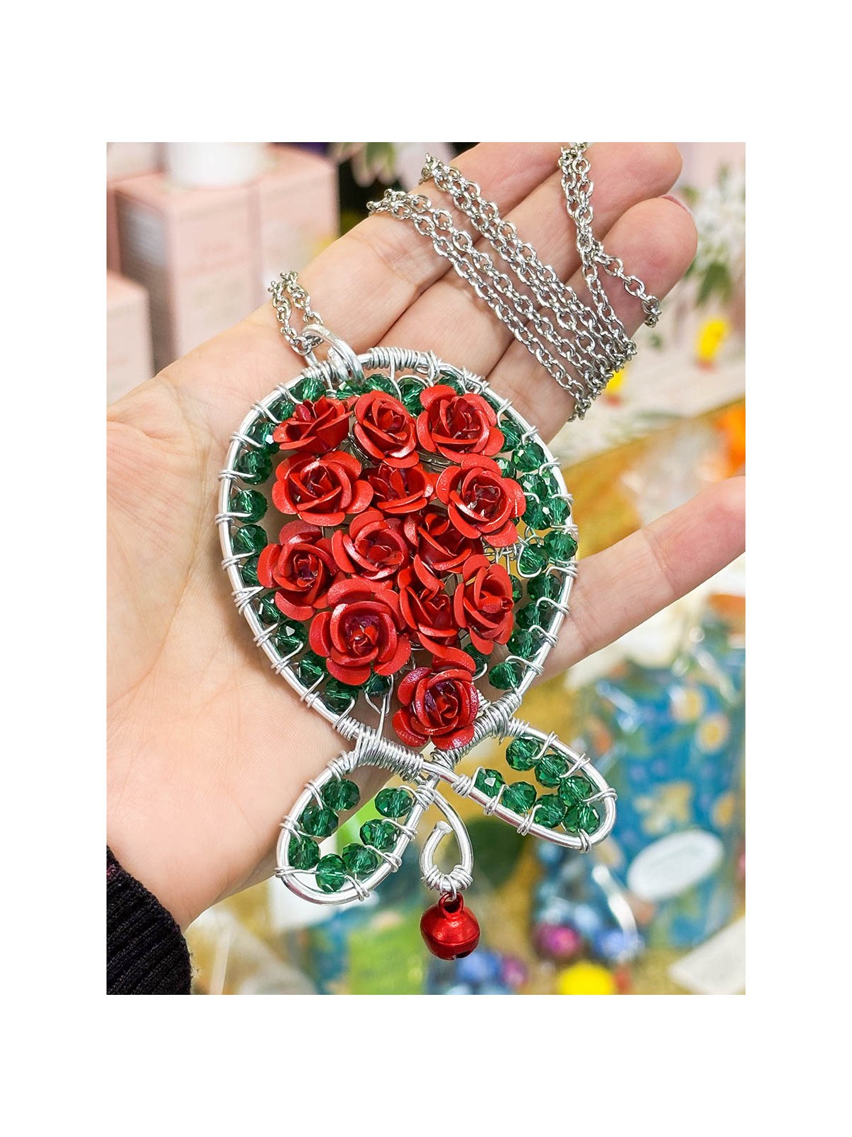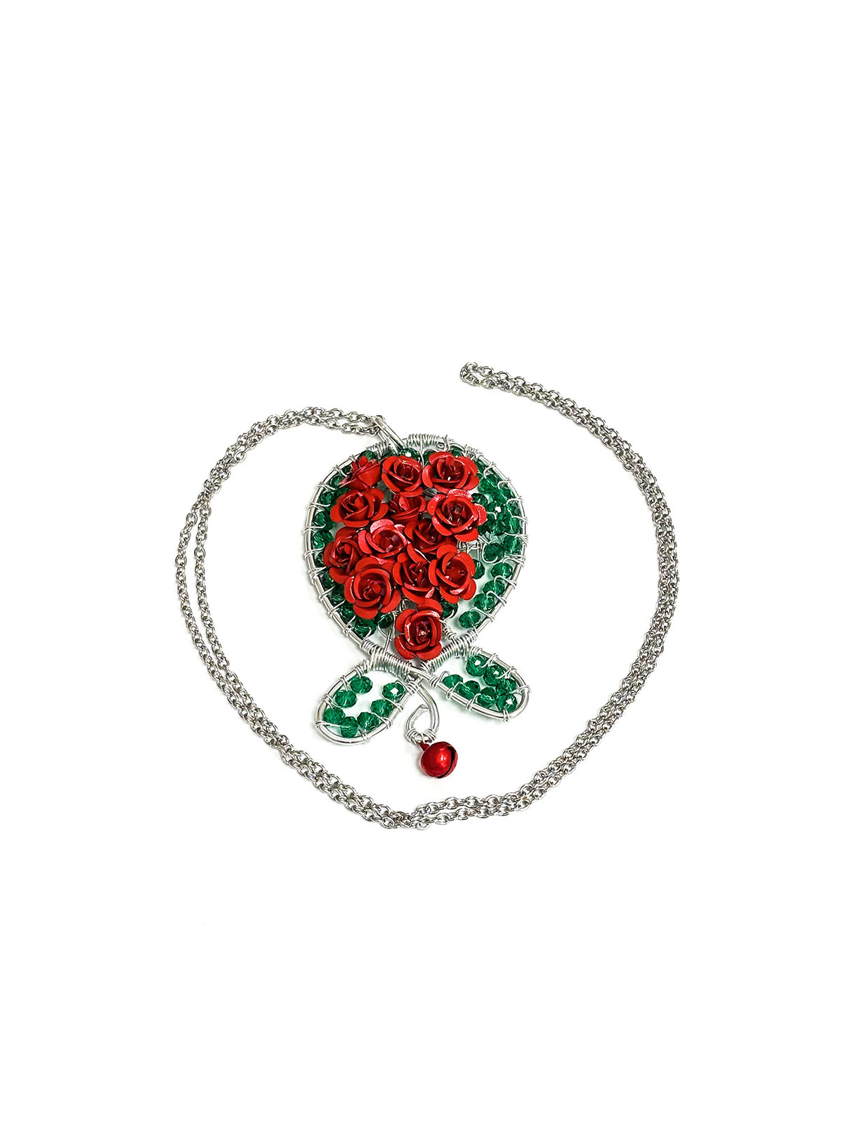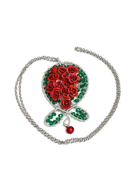 Collana lunga con ciondolo ottenuto con tecnica wire con filo di alluminio placcato argento, con ciondolo "mazzo di rose rosse". Nichel-free.