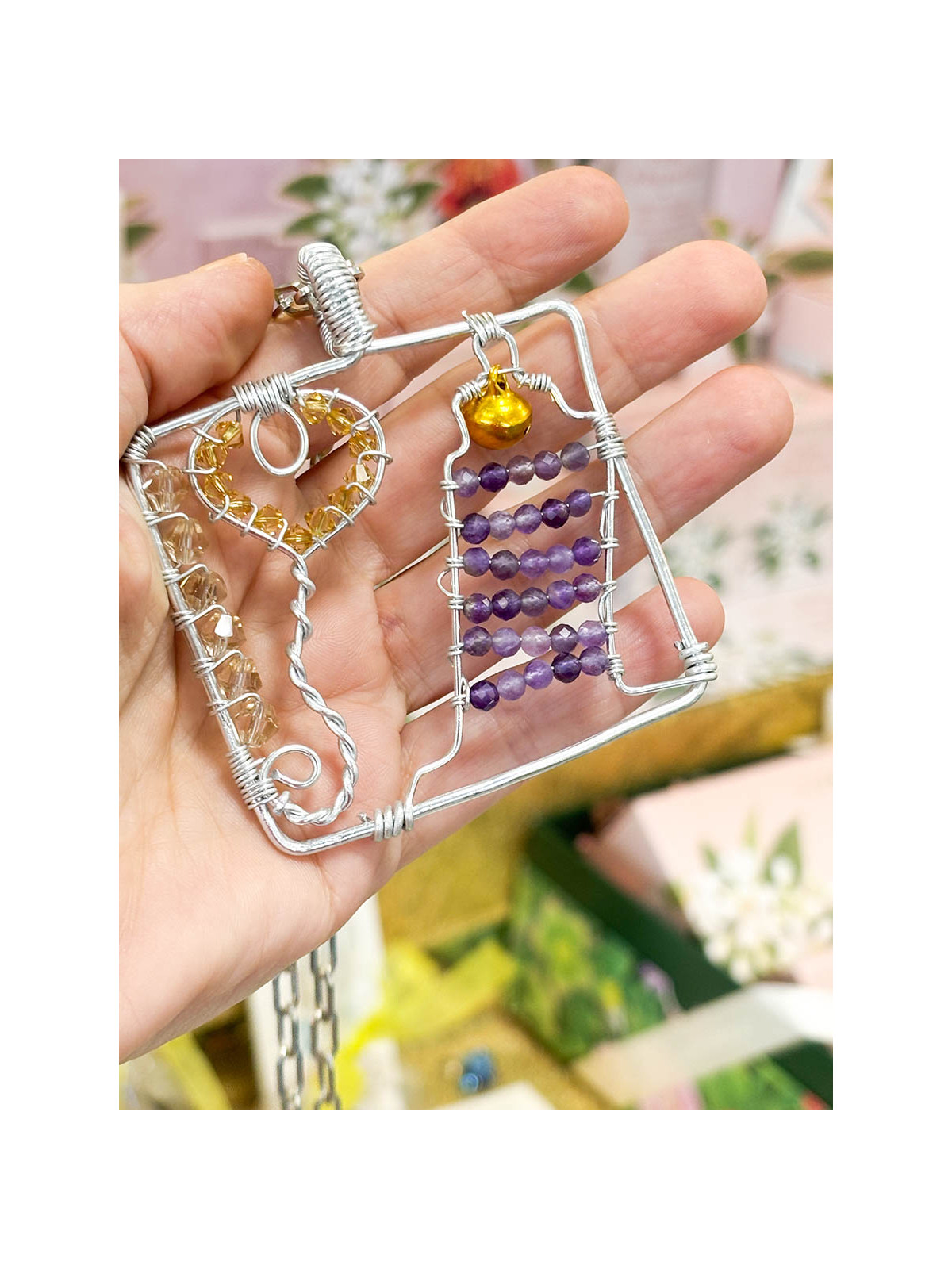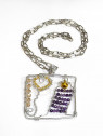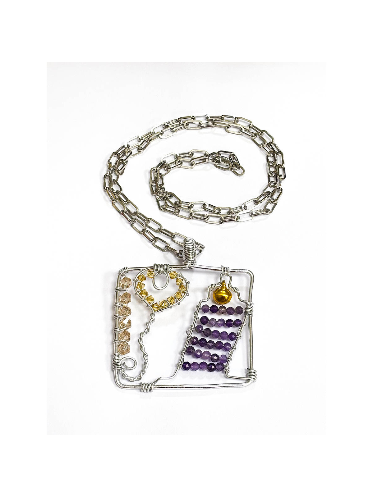 Collana lunga con ciondolo ottenuto con tecnica wire con filo di alluminio placcato argento, con ciondolo "Torre di Pisa". Pietre di ametista sfaccettata e cristalli. Nichel-free.