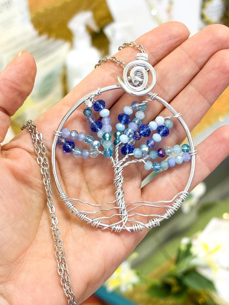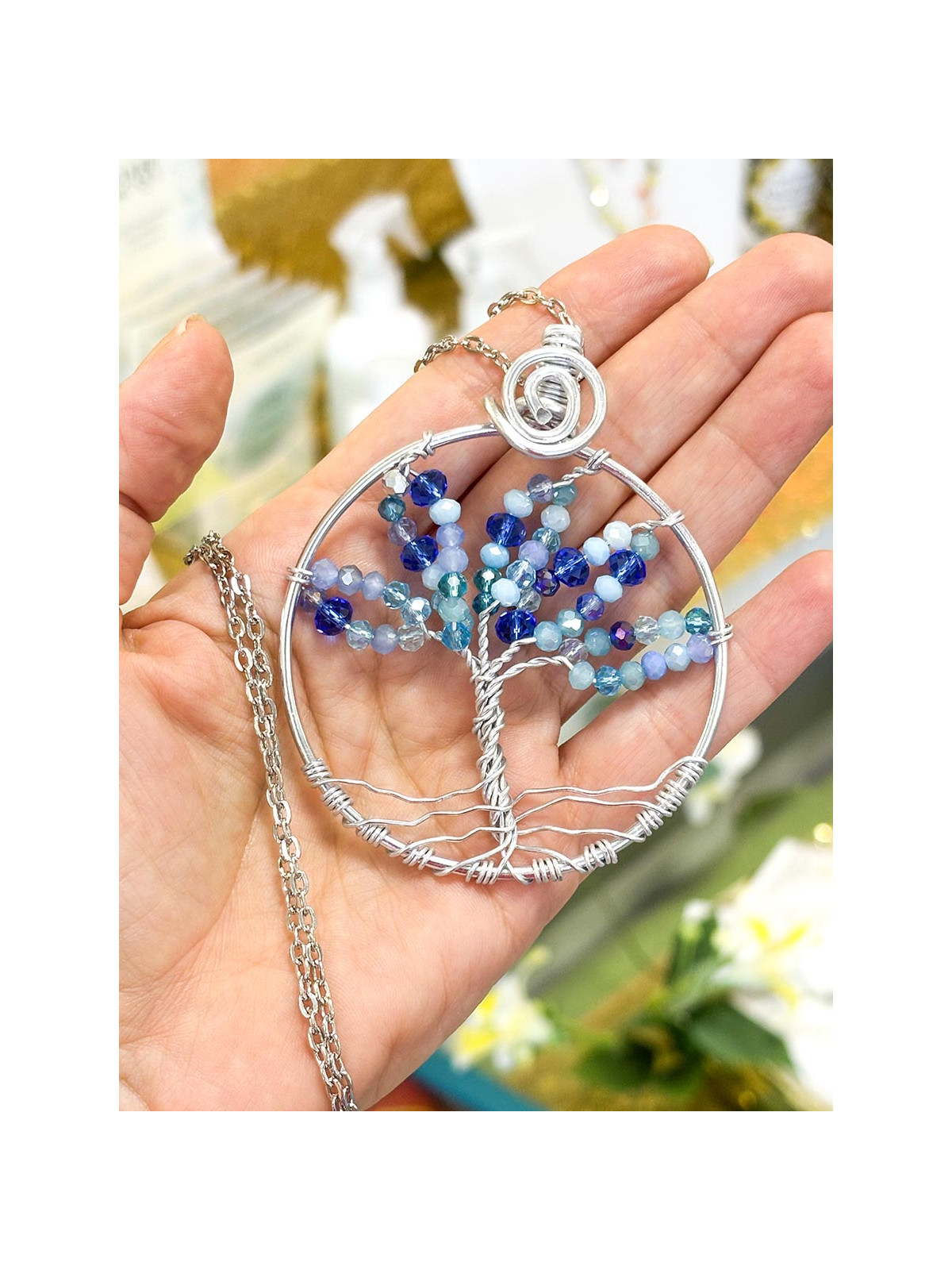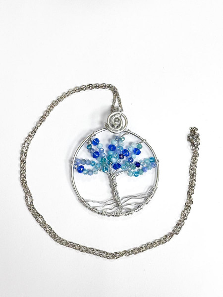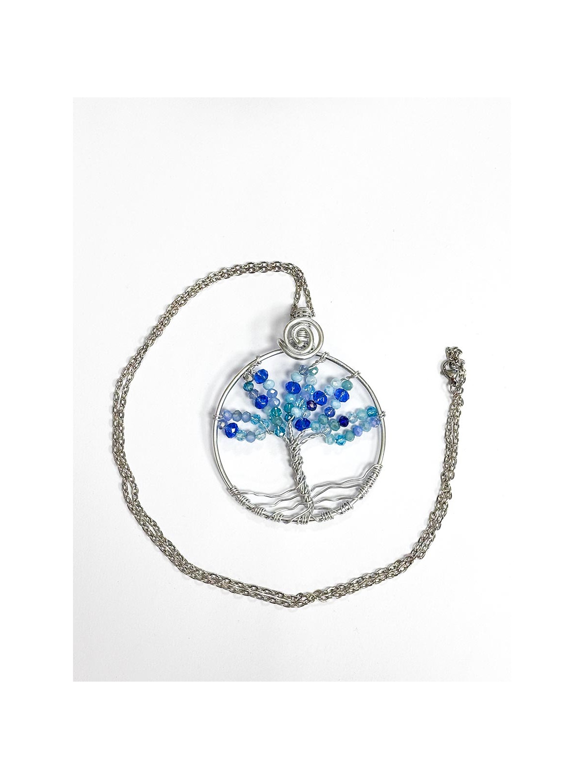 Collana lunga con ciondolo ottenuto con tecnica wire con filo di alluminio placcato argento, con ciondolo "Albero della vita" con cristalli sul celeste/blu. Nichel-free.
