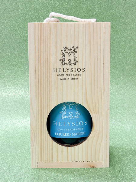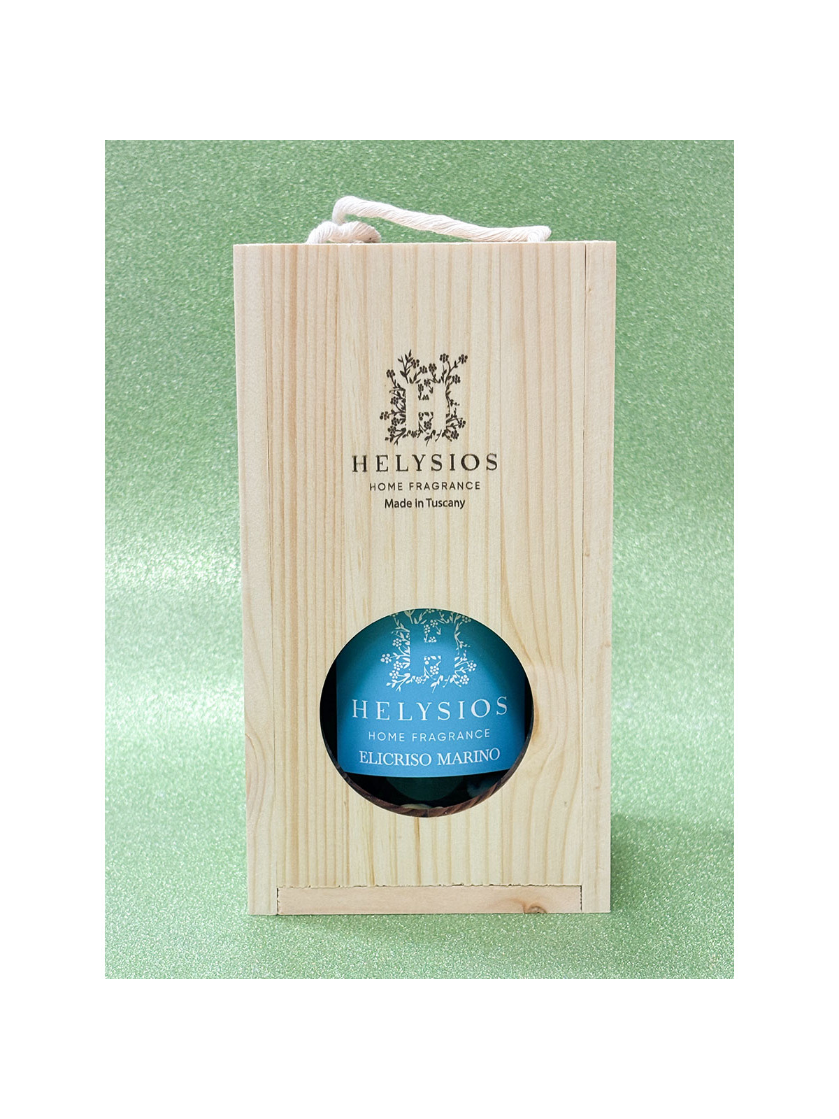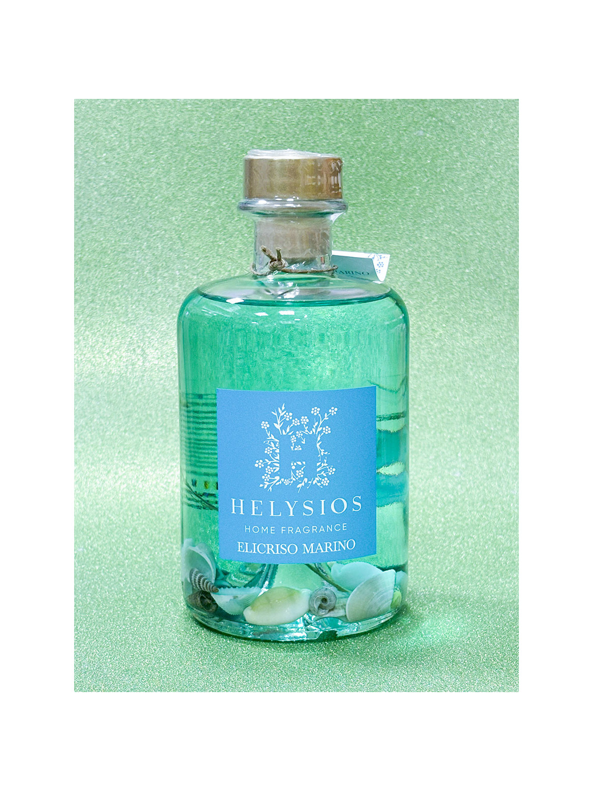Profumo per ambiente a base di Elicriso. Vaso in vetro che contiene sul fondo veri fiori di elicriso e conchiglie, formato: 500ml con elegante scatola in legno. Bastoncini di Rattan inclusi (non mostrati nell'immagine).