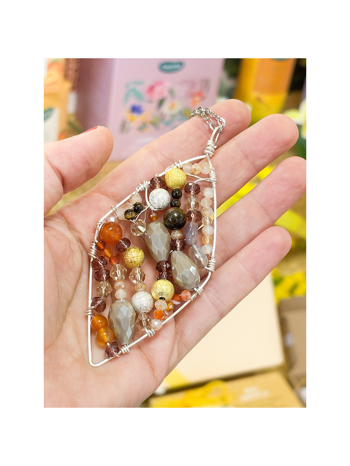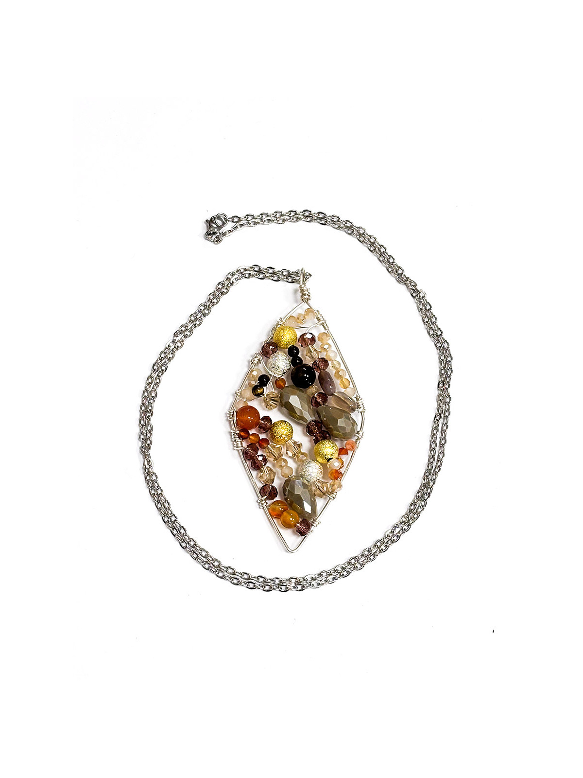 Collana lunga con ciondolo ottenuto con tecnica wire con filo di alluminio placcato argento, con pietre e cristalli. Nichel-free.