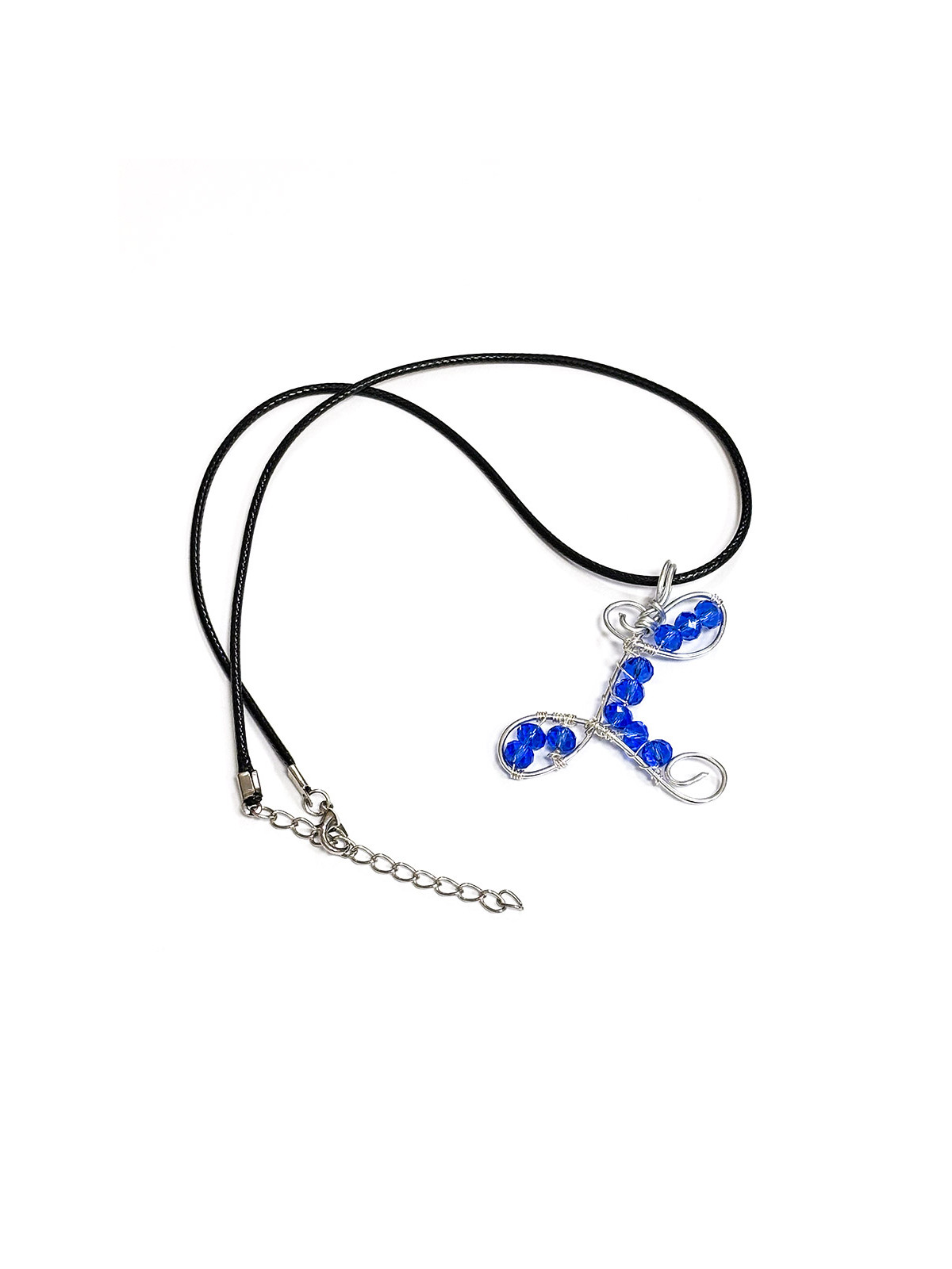 Collarino regolabile in caucciù con iniziale ottenuta con tecnica wire con filo di alluminio placcato argento e cristalli. Nichel-free.