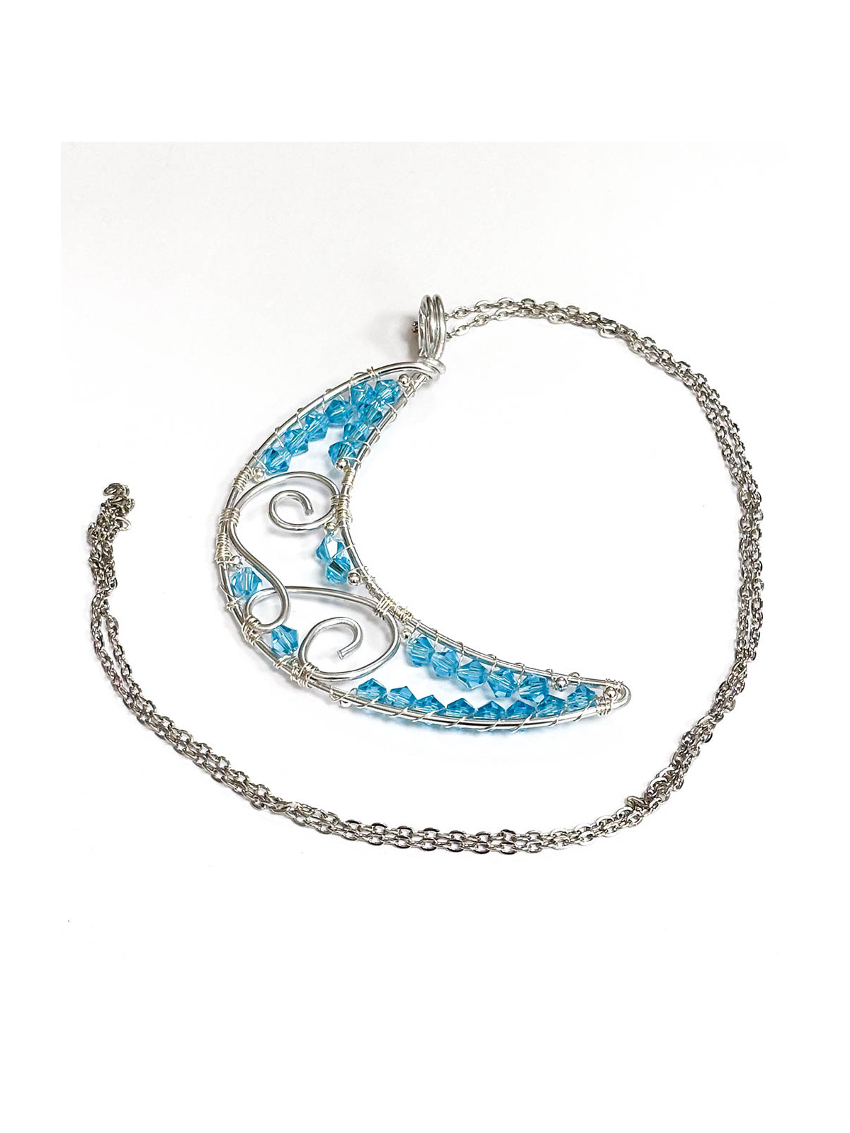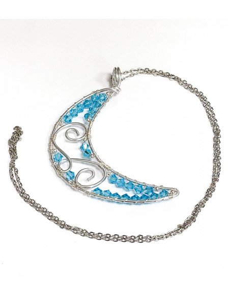 Collana lunga con ciondolo ottenuto con tecnica wire con filo di alluminio placcato argento, con cristalli. Nichel-free.