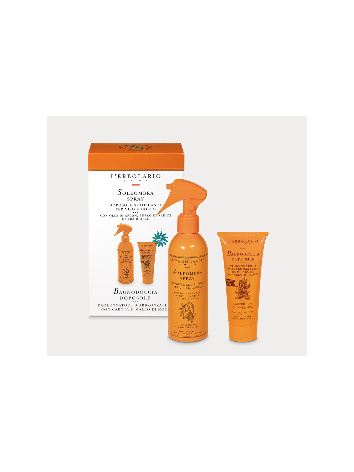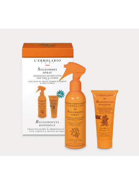Consigli d'uso: Dopo aver inumidito la pelle, massaggiare delicatamente il Bagnodoccia e risciacquare con acqua tiepida. Dopo la detersione, stendere il doposole spray Soleombra sulla pelle di viso e corpo e massaggiare leggermente fino ad assorbimento.