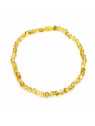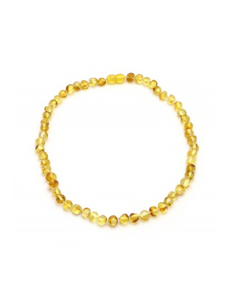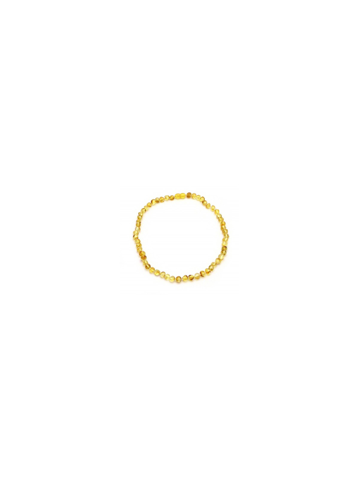 L’ambra è una resina costituita da linfa di pino pietrificata milioni di anni fa. Da oltre 7000 anni viene usata come pietra terapeutica ed amuleto. È molto leggera ed agisce come una spugna in quanto assorbe energie negative, emozioni di disagio e blocchi energetici. Questo affascinante fossile possiede una grande forza elettrostatica, ha la capacità di proteggerci dai campi elettromagnetici (pc, telefonini, tv), toglie le tensioni, combatte le cefalee e favorisce il sonno. Quando un bambino mette i denti le cellule infiammate trattengono i liquidi formando campi di tensioni, che, premendo sulle mucose, generano la sensazione del dolore. L’ambra può sciogliere queste tensioni, i bimbi provano giovamento, sono più calmi e dormono meglio. Circonferenza: circa 32 cm.