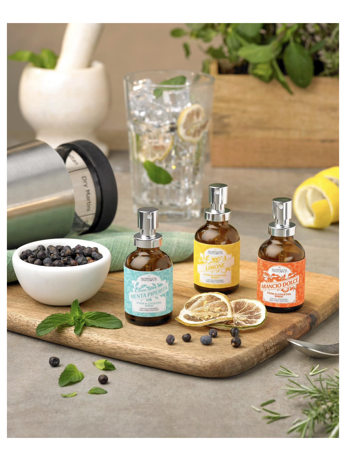 Dona ai tuoi piatti inaspettati tocchi di gustoso benessere! Formulati utilizzando oli essenziali di origine biologica diluiti in una miscela di alcol vegetali, gli Oli Essenziali Food & Cocktail Spray sono semplici e pratici da utilizzare: bastano poche nebulizzazioni sul piatto o sul cocktail per godere dei profumi e dei sapori della natura a tavola.