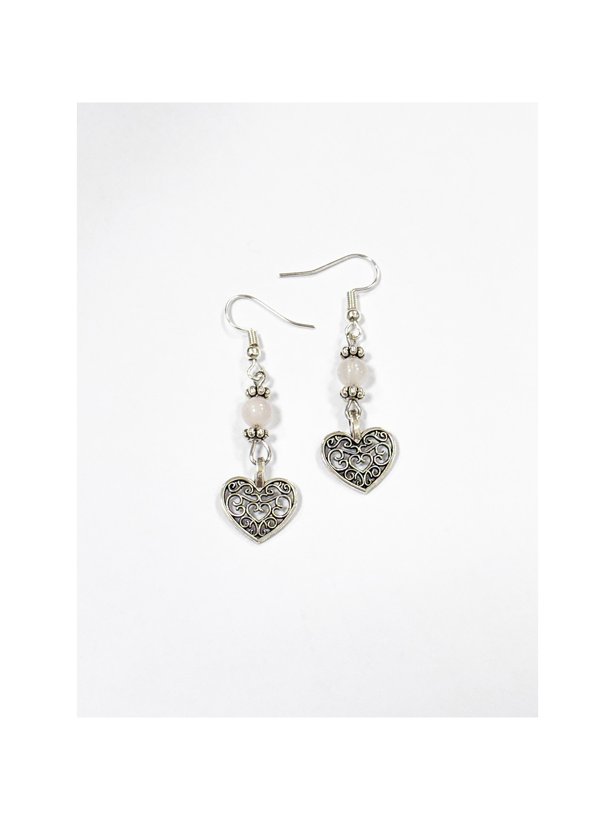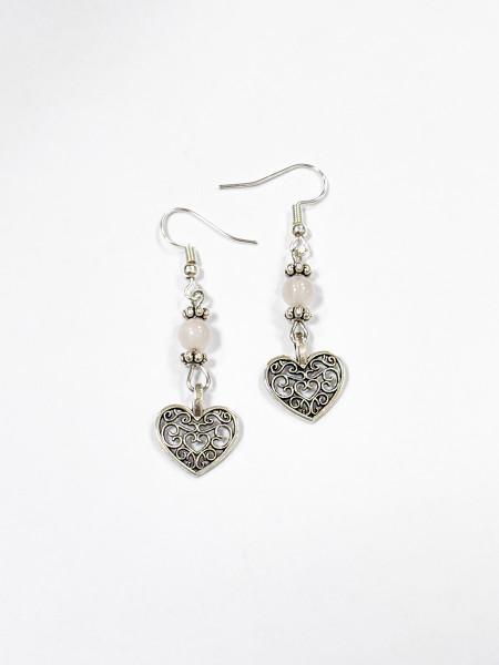 Orecchini in pietre di Quarzo Rosa di grado A, diametro grani circa 6 mm. Charm Cuore. Inserti in metallo nichel-free.