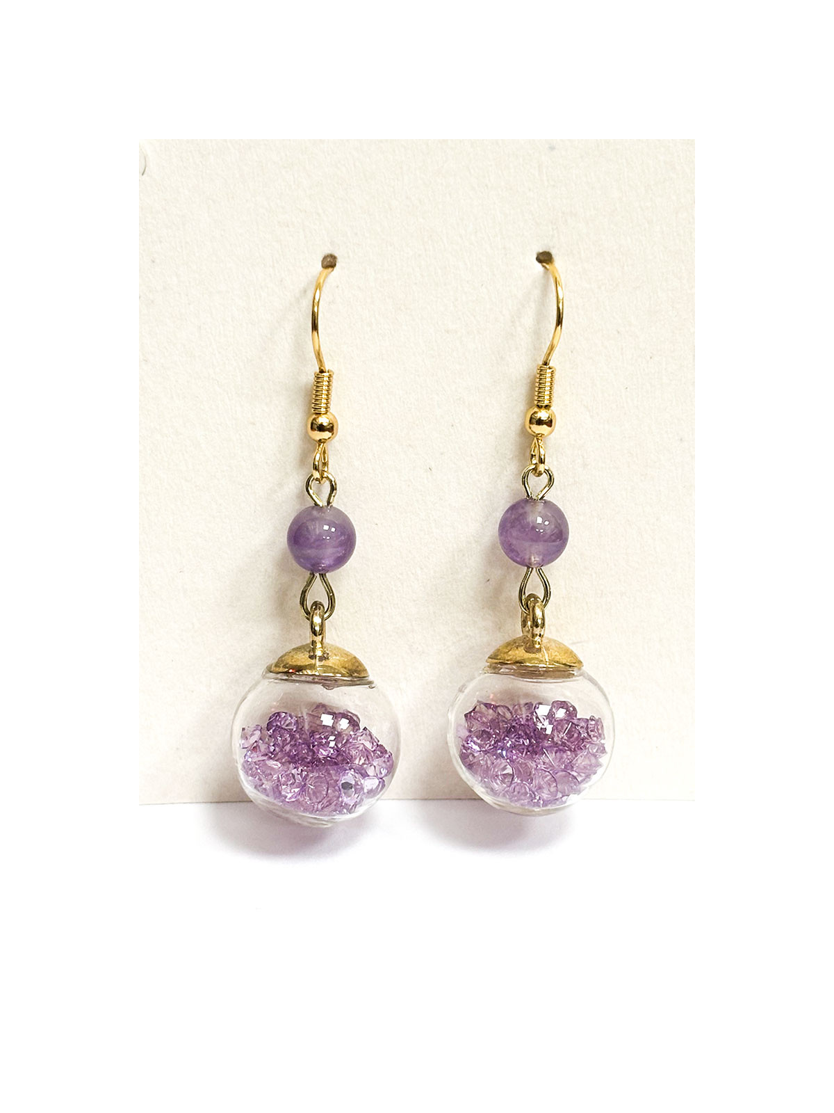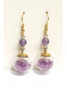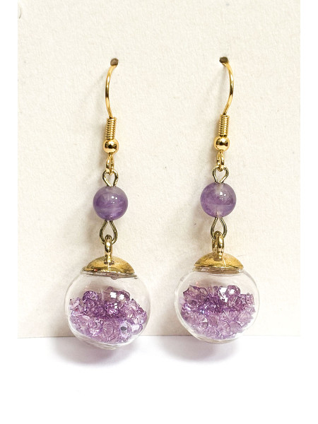 Orecchini con ametista chiara (6 mm) e sfera di vetro e frammenti di ametista.