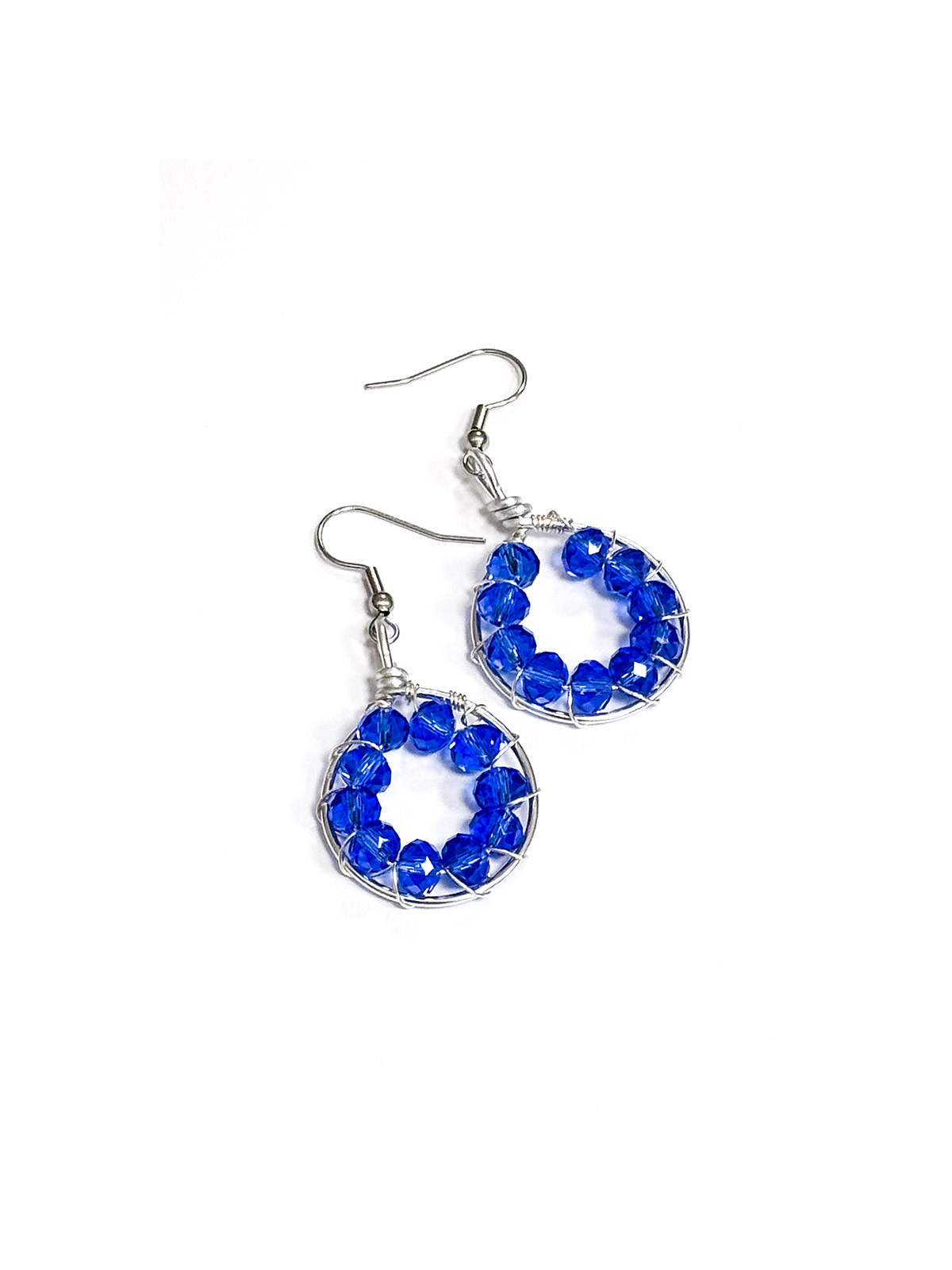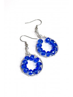 Orecchino ottenuto con tecnica wire con filo di alluminio placcato argento, con perline sfaccettate di vetro azzurro. Nichel-free.