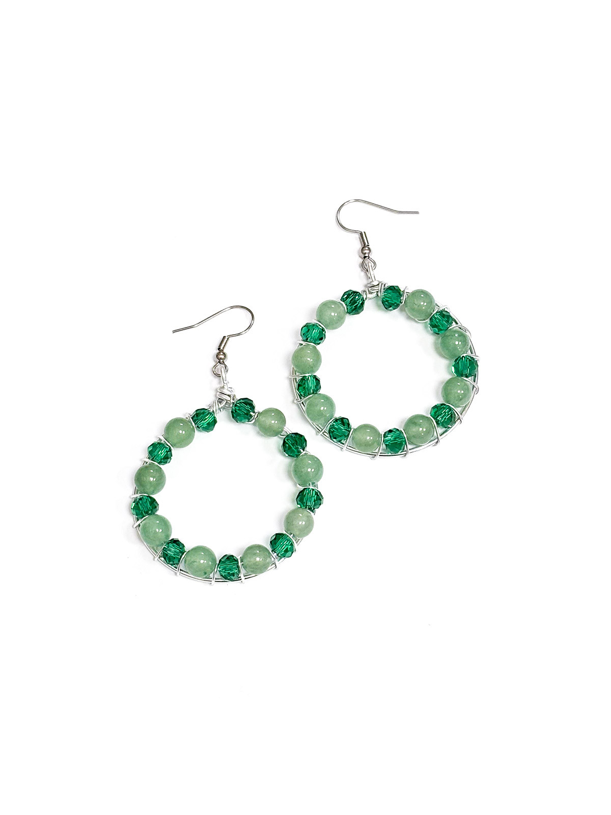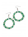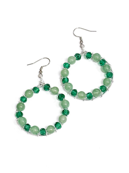Orecchino ottenuto con tecnica wire con filo di alluminio placcato argento, con pietre di avventurina verde e cristalli verdi. Nichel-free.