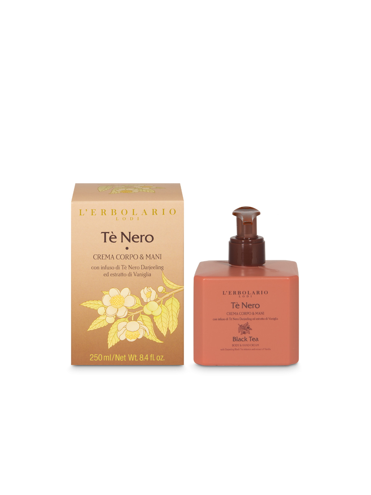 Racchiusa in un elegante flacone con pratico dispenser dosatore, questa Crema profumata è studiata per prendersi cura di mani e corpo con dolcissime attenzioni. I suoi attivi principali, l’infuso e l’estratto di Tè Nero Darjieeling e l’estratto di Vaniglia, vantano proprietà tonificanti e addolcenti, mentre i ricchi burri nutrienti di Cocco, Cacao e Sal insieme ai pregiati oli di Cartamo e Camelia offrono nutrimento ed emollienza. Grazie alla texture fluida l’assorbimento è veloce e la pelle si riscopre morbida e vellutata, esaltata dalla scia profumata misteriosa e raffinata. Senza siliconi, parabeni e petrolati 97% ingredienti di origine naturale La restante percentuale di ingredienti garantisce stabilità e gradevolezza del prodotto.