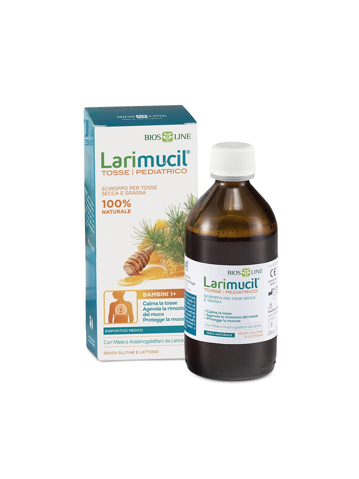 Larimucil® Tosse Pediatrico contiene Arabinogalattani da Larice, Piantaggine, Altea e Lichene islandico. Questi componenti vegetali formano sulla mucosa delle prime vie aeree un film protettivo che, contrastando il contatto con agenti esterni irritanti, calma la tosse. I suoi componenti opportunamente selezionati favoriscono inoltre l’idratazione delle mucose, agevolando così la rimozione del muco in eccesso. Gli Arabinogalattani da Larice e i polisaccaridi di Piantaggine, Altea e Lichene islandico hanno proprietà mucoadesive e protettive, che associate a quelle emollienti del Miele proteggono le mucose delle prime vie aeree. Larimucil® Tosse Pediatrico ha un gusto gradevole, grazie alla presenza di succo concentrato di mela e olio essenziale di arancio dolce. Indicato a partire da 1 anno di età.